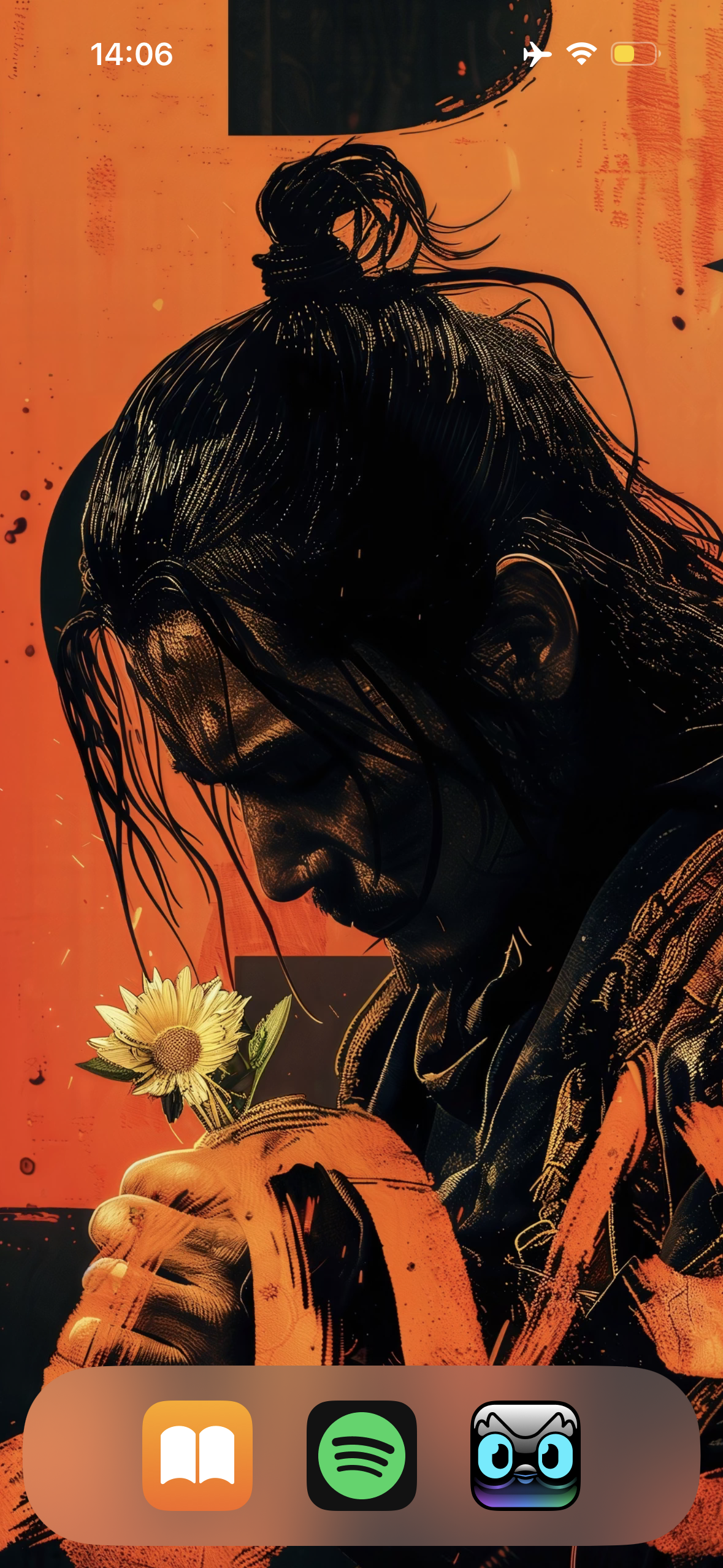 - Clean Your Home Screen. This is more of a personal aesthetic preference on my end, but it works well. Remove all apps from your home screen, put an inspirational background, and put the apps you want to make normal behaviour on your bottom row. Here’s my current one below (07/24), with Music, Books, and your favourite Duolingo Language across the bottom. It’s so easy to default to something on your phone: make sure your defaults are what you want.