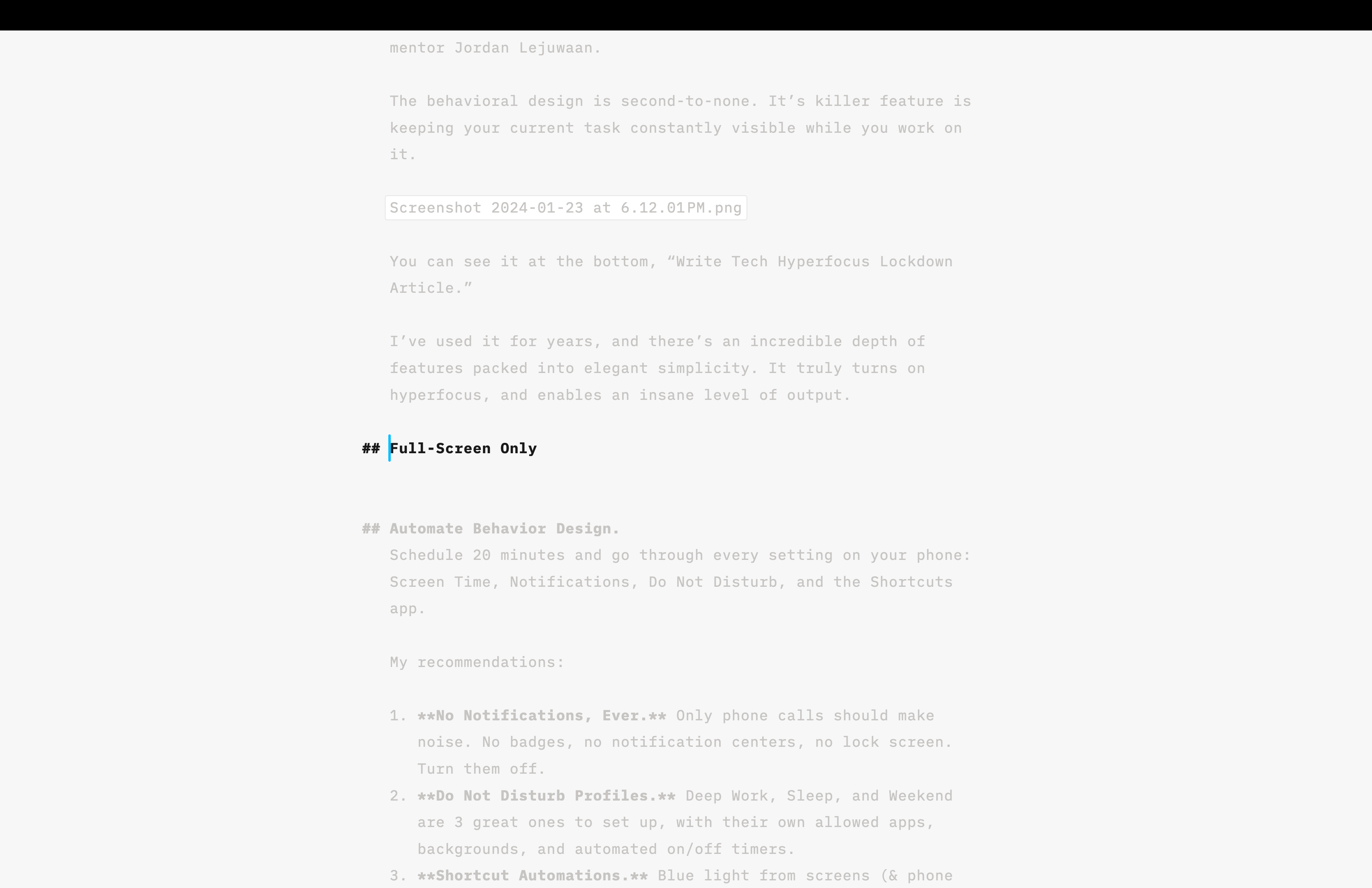Self-explanatory. Work on one thing at a time. Full screen all your apps. I love the iA Writer app. It greys out every sentence except for the exact one you’re writing.