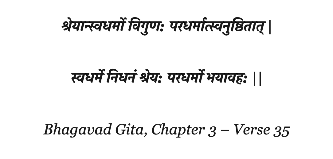 "It is far better to perform one’s natural prescribed duty, though tinged with faults, than to perform another’s prescribed duty, though perfectly. In fact, it is preferable to die in the discharge of one’s duty, than to follow the path of another, which is fraught with danger." – Bhagavad Gita